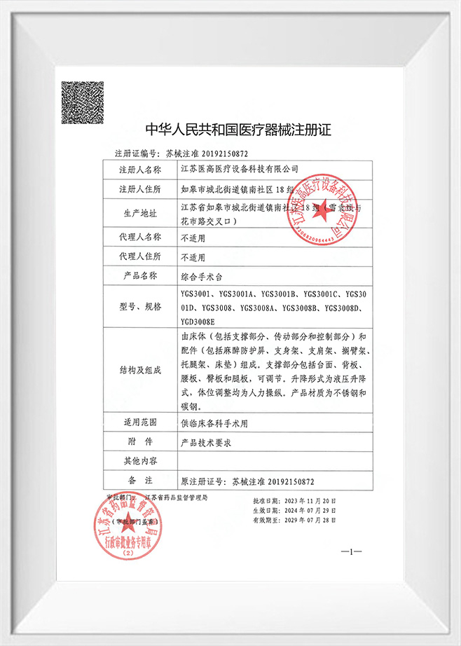 Certificato di registrazione della lampada chirurgica a LED senza ombre